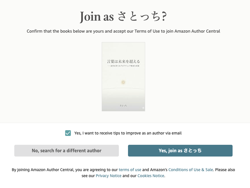 - この画面は「この著者名で著者セントラルに参加しますか?」という確認である。