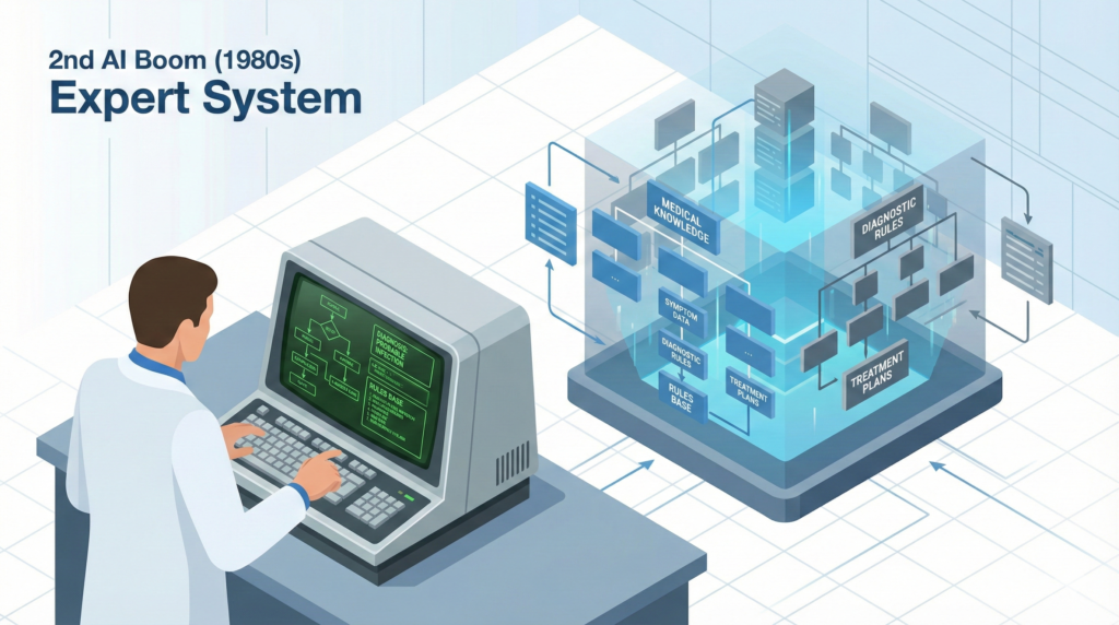 1980年代に入ると、人工知能(AI)は「エキスパートシステム」として新たな段階に突入しました。エキスパートシステムは、特定の領域の専門知識を模倣し、推論を行う能力を有しており、医療診断から化学分析、地質調査まで、多岐にわたる分野で複雑な問題解決に貢献しました。 実際に開発されたエキスパートシステムを以下に紹介します。